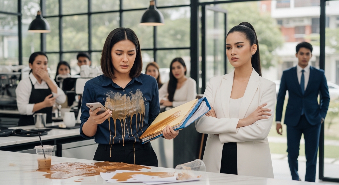 Bumasa ang malamig na kape sa aking blusa, dumaloy pababa sa leeg ko, at tumulo sa mga dokumentong ilang araw kong inayos. Kumulot ang mga papel habang sinisipsip ang likido.