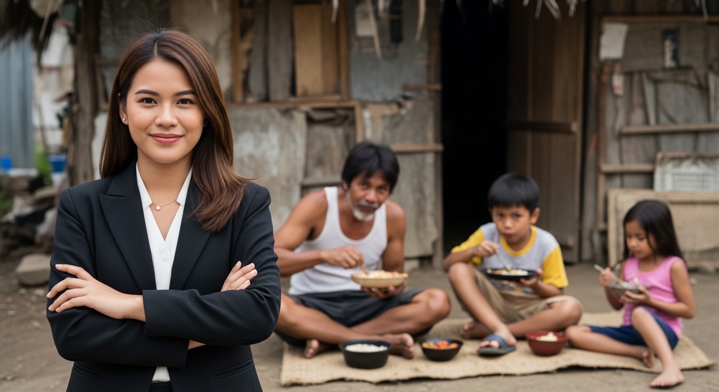 Makaraan ang tatlumpung minuto, marahang umusad ang itim na Mercedes-Benz sa mga kalsadang walang semento, iniwasan ang mga baha, askal, at mga batang naghahabulan nang walang sapatos. Maliit at payak ang mga bahay, halos pinagtagpi-tagpi ng iba’t ibang pintura. May ilang kapitbahay na napatigil at napatingin—parang may UFO na lumapag sa gitna ng baryo.