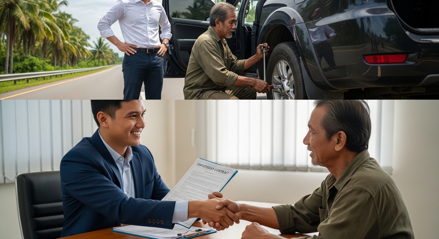 Dali-daling kumilos si Lando. Sa loob ng labinlimang minuto, naibaba niya ang sirang gulong, naikabit ang reserba, at sinigurong mahigpit ang mga turnilyo. Tahimik lang ang lalaki habang pinagmamasdan siya, bahagyang nagtataka.